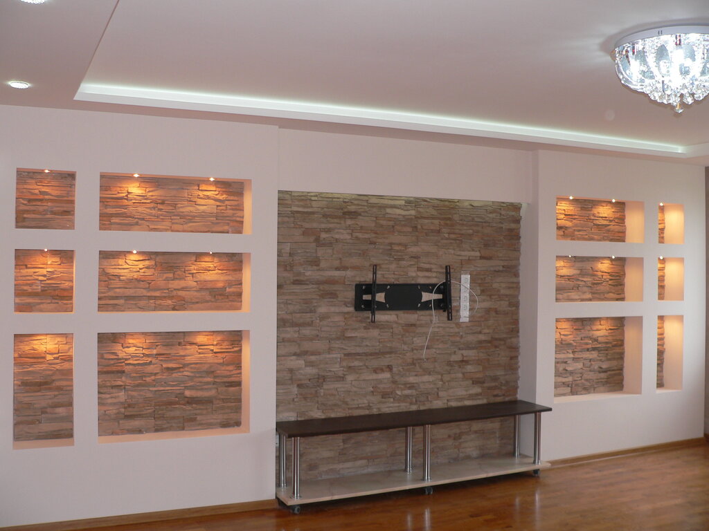 Углубление во всю стену, декорированное с помощью световых элементов, значительно преобразит поверхность стен и даже при небольшой глубине, будет смотреться очень эффектно и выгодно.