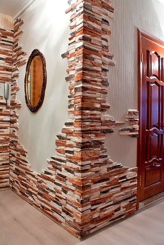 Обратите внимание: В комнате лучше отделывать угол, одну стену или ее часть. Кладка подходит для выступающих или отдельно стоящих элементов — квадратных колонн, вокруг ниш и проемов.