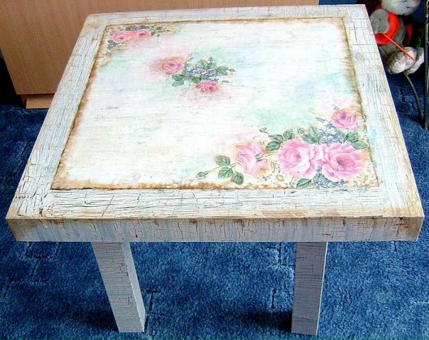 Стеклянный столик обновлять придется немного по другому. Заклеить его обоями, пленкой или сделать декупаж вполне можно с внутренней стороны.