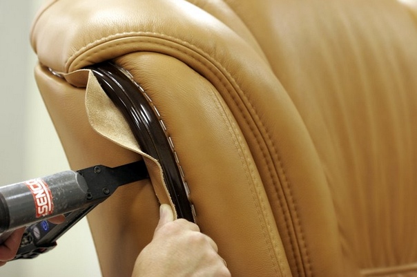 Сам процесс перетяжки не представляет особой сложности. Если выкройка сделана правильно, то дальше уже сложно ошибиться. Вам нужно просто закрепить детали обивки к каркасу при помощи мебельного пистолета.