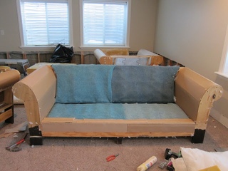 Начинают перетяжку дивана со снятия старой обивки и мягких слоев, если есть потребность, меняют также сломанные деревянные детали. Все части дивана проверяют на прочность, подкручивают шурупы, укрепляют стыки и, если нужно, проклеивают сочленения. Поскольку старые древесностружечные плиты иногда выделяют вредные испарения, их также можно заменить.
