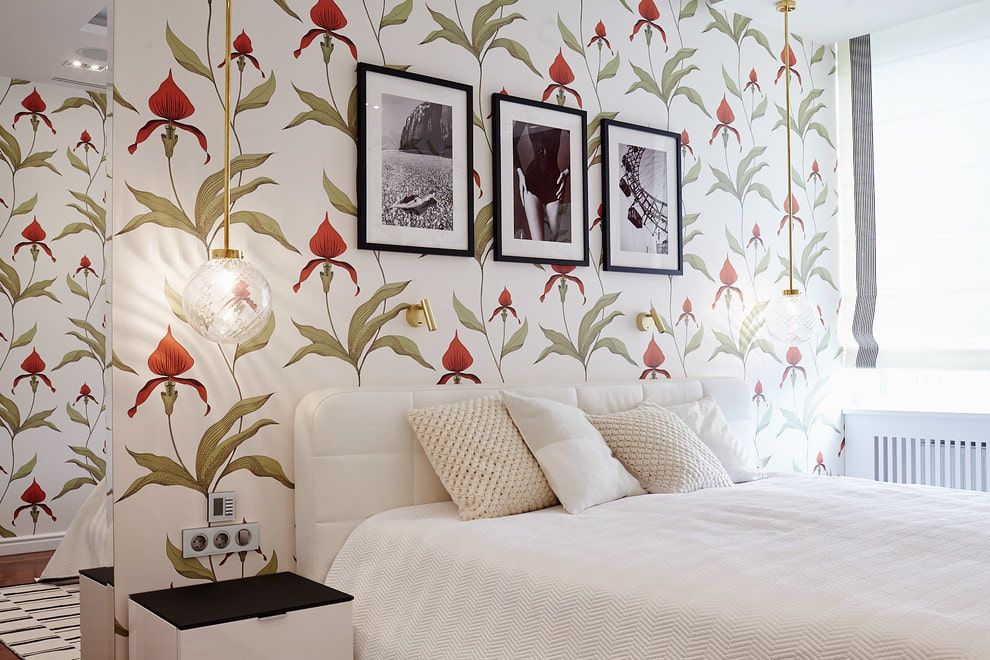 Правильным вариантом использования обоев с крупным рисунком неконтрастного цвета будет оклейка ими одной стены комнаты, у которой ставится невысокая мебель, например, диван или кровать. Например, использование обоев с цветочным принтом будет эффектно смотреться в спальне у изголовья кровати.