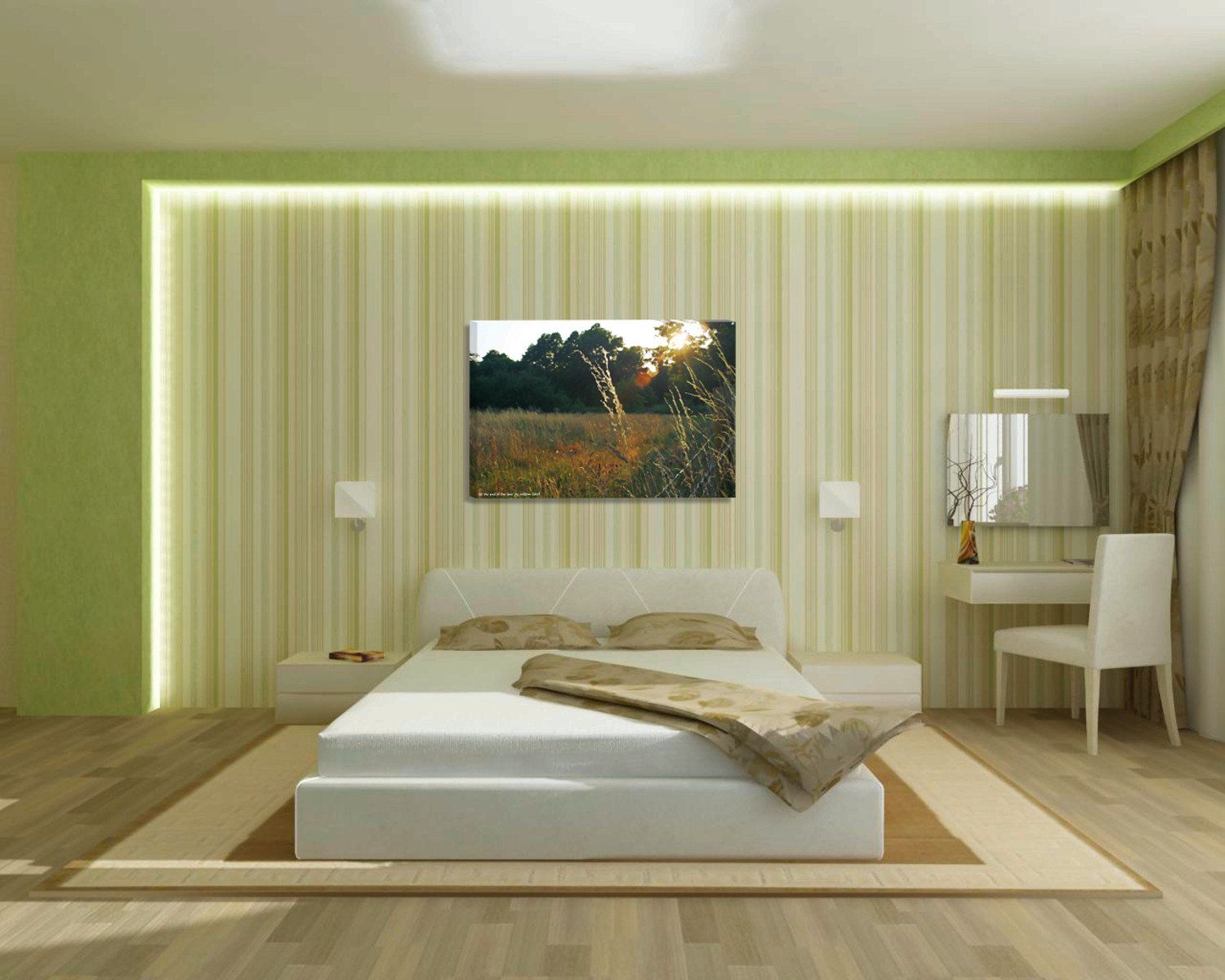 Художественную привлекательность, глубину и эксклюзивность дизайна придадут фотообои, которыми отделывают центральную стену. В небольших комнатах не стоит оформлять стену фотообоями с одним крупным изображением – например, автомобилем или деревом. Фотообои лучше выбирать в нужных тонах с видовой перспективой.