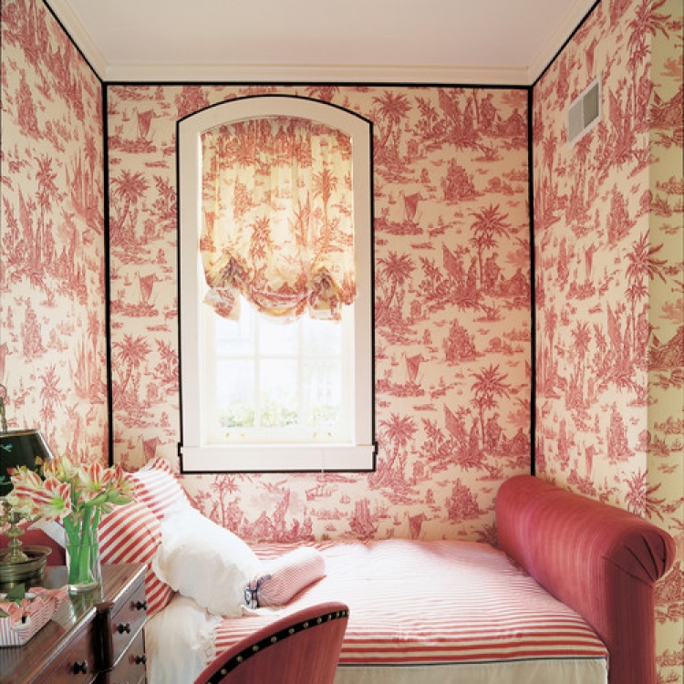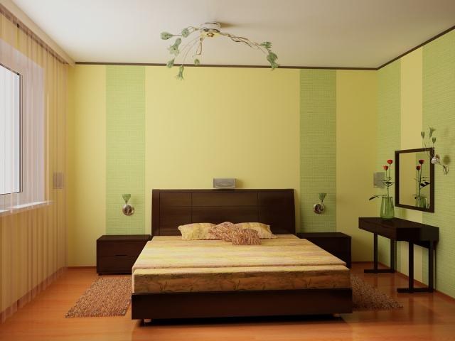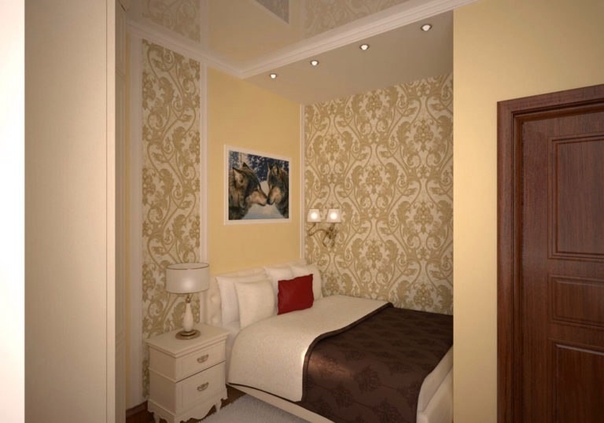 В спальне за изголовьем кровати и над ней на потолке можно приклеить обои одной расцветки, чтобы стена как бы переходила в потолок для создания иллюзии ниши, все остальные стены оклеить однотонными обоями контрастным цветом. Визуально часть стены, переходящая в потолок, смотрится как дополнительное пространство.