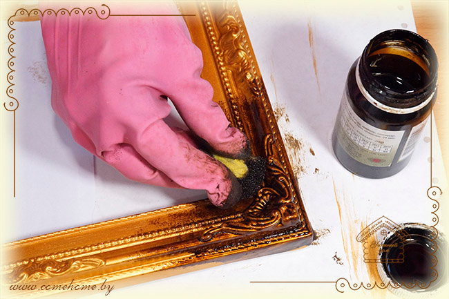 Таким же образом можно перекрасить и уже готовый багет. Нанести на него в два слоя жидкую краску из серии «Деколор» Декоративный, оставить до полного высыхания. Битумный лак нанести и сразу растереть. Закреплять после полного высыхания битумного лака шеллачным спиртовым.