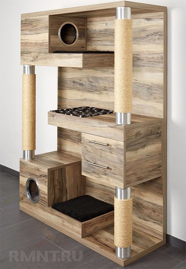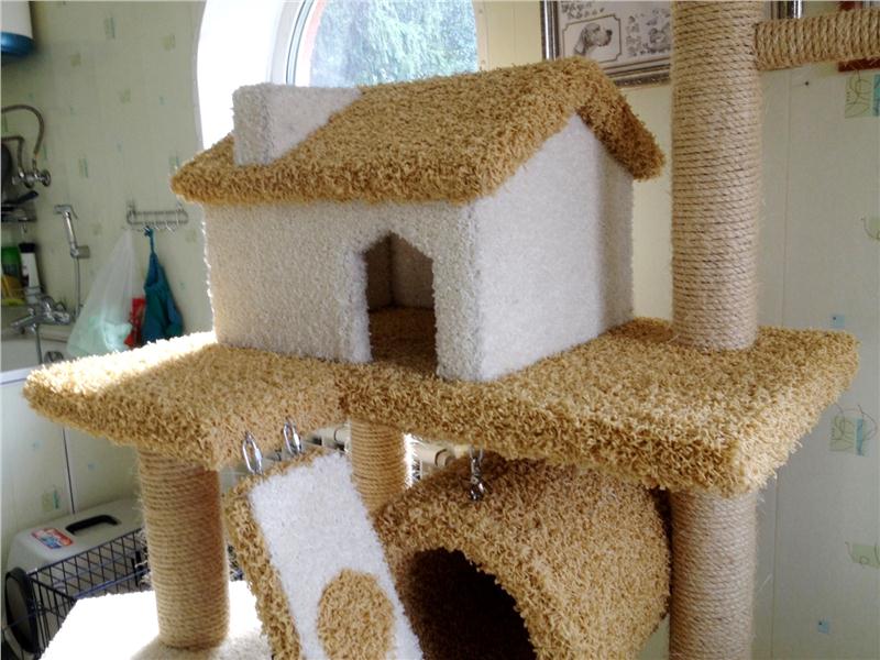 Если позволяет пространство квартиры, то многоуровневая когтеточка из столбиков, полочек и домиков станет местом не только для обтачивания копей, но также для сна и активных игр.
