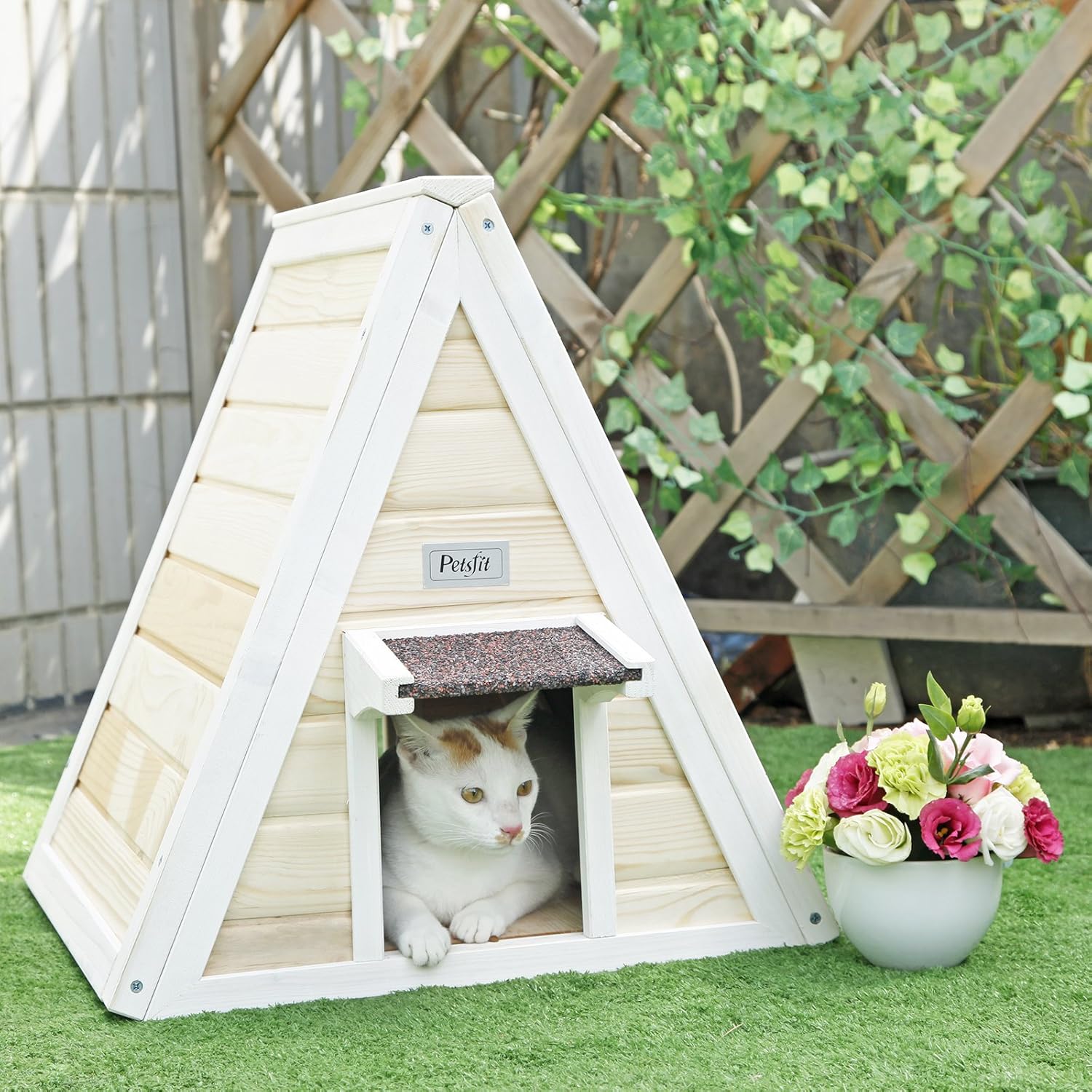 Наклонная крыша может помешать хищникам сесть на крышу кошачьего домика и дождаться выхода дикой кошки. Эта конструкция также может предотвратить оседание воды или мусора на верхней части укрытия зимой.