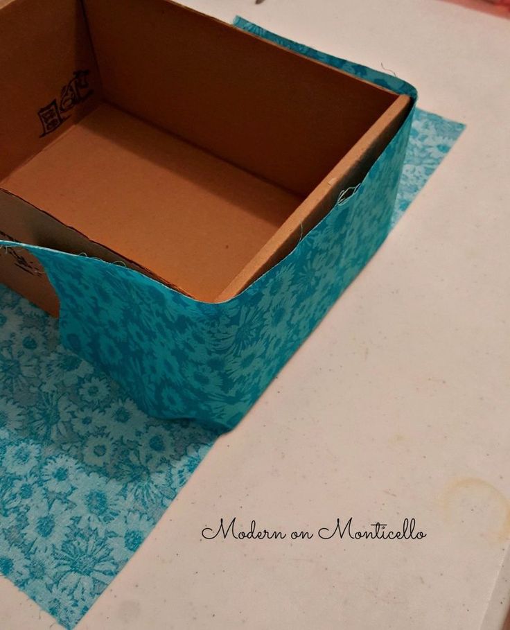 Ослабьте оберточную бумагу настолько, чтобы нанести тонкий слой клея по краю на внутренней стороне коробки, затем снова нанесите оберточную бумагу на клей.Я нанесла клей пальцем, но вы можете использовать ватный тампон, зубочистку или что-нибудь еще под рукой.