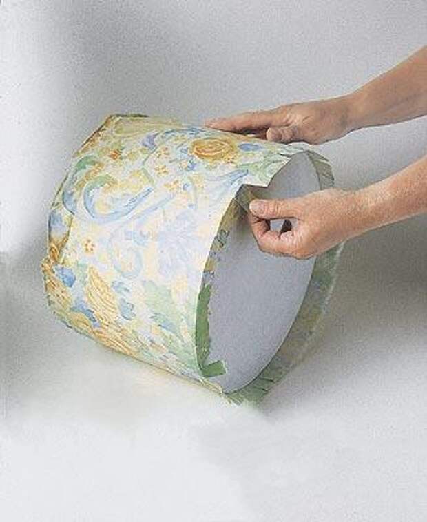 - Одну сторону бумаги приклеить к коробке, обернуть основу и приклеить второй край с нахлестом к отрезу.