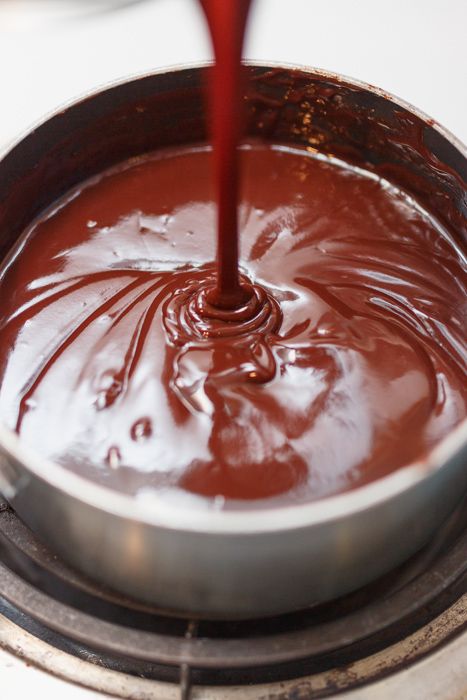 Основой рецепта является классическая шоколадная глазурь, получаемая горячим способом. В теплом виде она имеет жидковатую консистенцию, поэтому применяется для поливки тортов и порционных десертов. Состав: