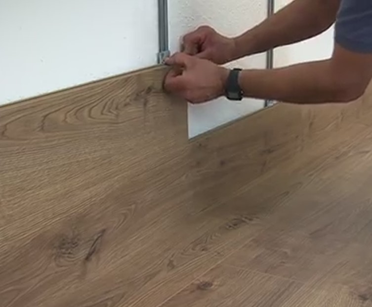 При горизонтальном размещении ламината требуется закрывать все стыки посредством плинтусов. Их крепят каждые пол метра от друг друга. Это необходимо, чтобы весь ряд не сложился «гармошкой».