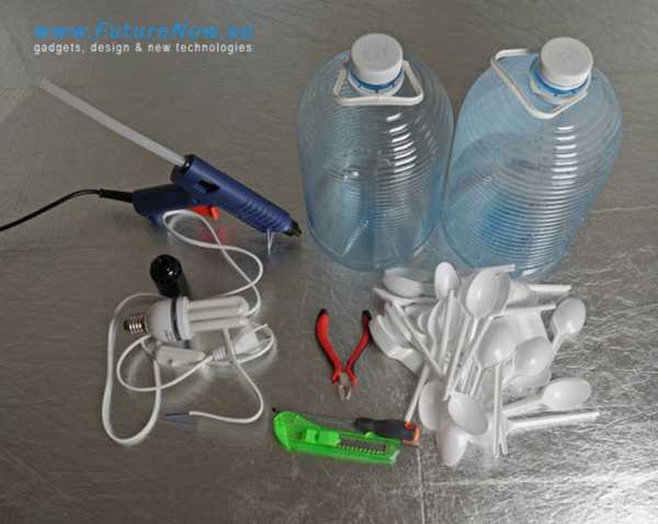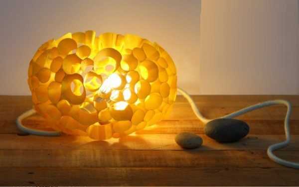 На картинке изображен еще один вариант собственноручного светильника. В роли каркаса выступает обычная пластиковая бутылка. Кто бы мог подумать? А украшающим его абажурам выступают такие же пластиковые ложки. Все идеальное – просто, а главное доступно