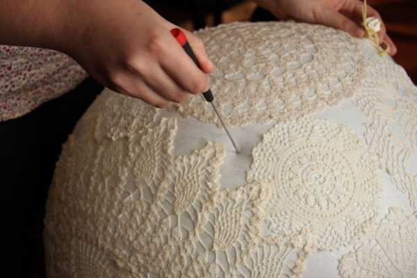 Абажур своими руками из нитей – писк в дизайне последних годов. Это могут быть вязальные или швейные нитки. Также отлично смотрятся уже связанные ажурные салфетки. Здесь не нужно беспокоиться о каркасе для абажура своими руками, его попросту не будет. Готовое изделие вешается на патрон. Итак, методика нитевого навеса: