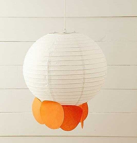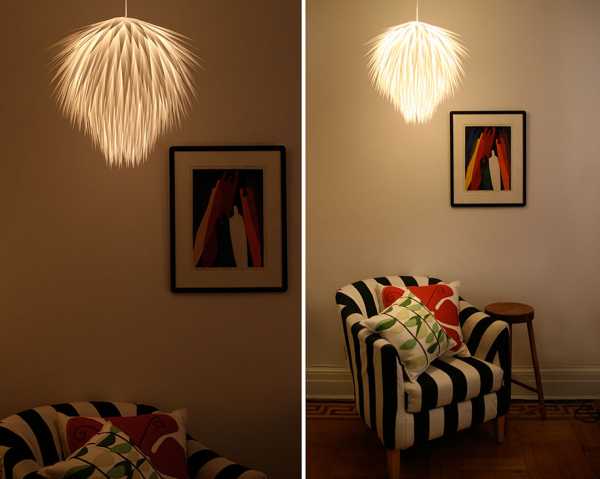 Оригинальный шарообразный светильник из легкой бумаги, декорированной более плотной бумагой в виде растущего цветка по всей поверхности