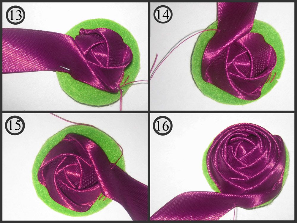 Нужно аккуратно накручивать ленту на центральную часть бутона. На каждом повороте прихватываем новый лепестковый ряд иглой с ниткой: