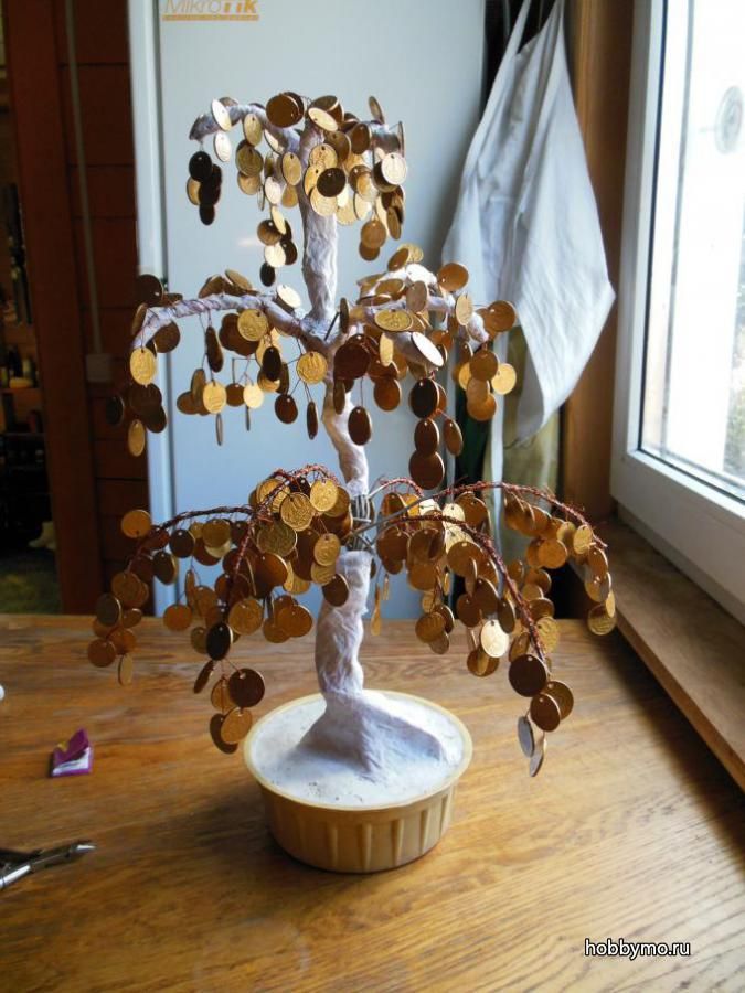 Этот топиарий обычно делается из фальшивых купюр, но для антуража можно прикрепить на крону дерева или подставку настоящие монеты. Конечно, лучше использовать не обычные, а редкие, старинные или иностранные монеты. Для начала каждую купюру нужно сложить пополам, чуть сдвинув края, а затем сложить из нее конвертик, закрепив неровные края двухсторонним скотчем. Количество купюр зависит от размеров шара-основы, но традиционно требуется около 20-25 купюр. Ствол денежного дерева можно сделать из веточек или палочекдля суши, а в качестве подставки взять кашпо. Кашпо с внешней стороны можно украсить специальной самоклеящейся бумагой с изображением денег или кружевами. В сам горшок заливают алебастр, ставят в него ствол и дожидаются его засыхания. После этого грунт топиария выкладывают монетами, опилками древесины или декоративным икамнями.