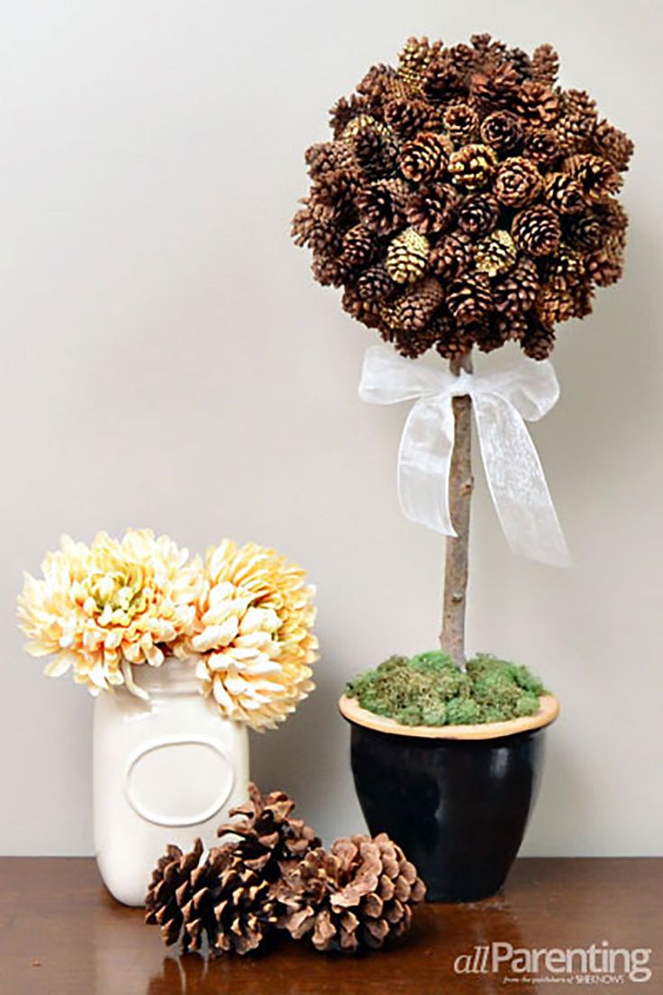 Топиарий из шишек своими руками изготавливается по схожей схеме. На пенопластовый шар приклеиваются небольшие сосновые полураскрытые шишки с маленькими промежутками друг от друга. Если промежутки получаются слишком большими, их можно заполнить желудями или каштанами.