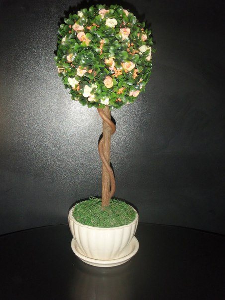 Алебастр трудно делать, а пенопласт легко найти. Только ствол в основание из пенопласта нужно вставить с первого раза. В это же время надо декорировать крону, приклеивая розочки в хаотичном порядке. Затем крона прикрепляется к стволу и топиарий считается готовым. При желании грунт в горшочке выкладывают искусственной травой, а ствол деревца украшают ярким бантом.