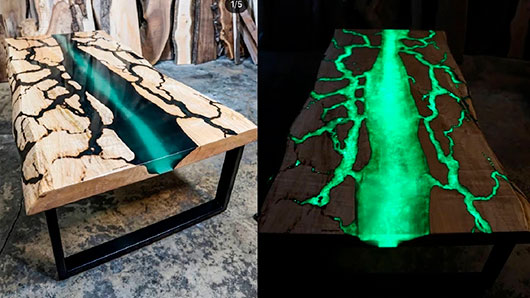 Например, берётся слэб дерева (это спил массива дерева), а по краю или середине идёт полоска эпоксидной смолы. Или составом заполняются только трещины, впадины слэба.