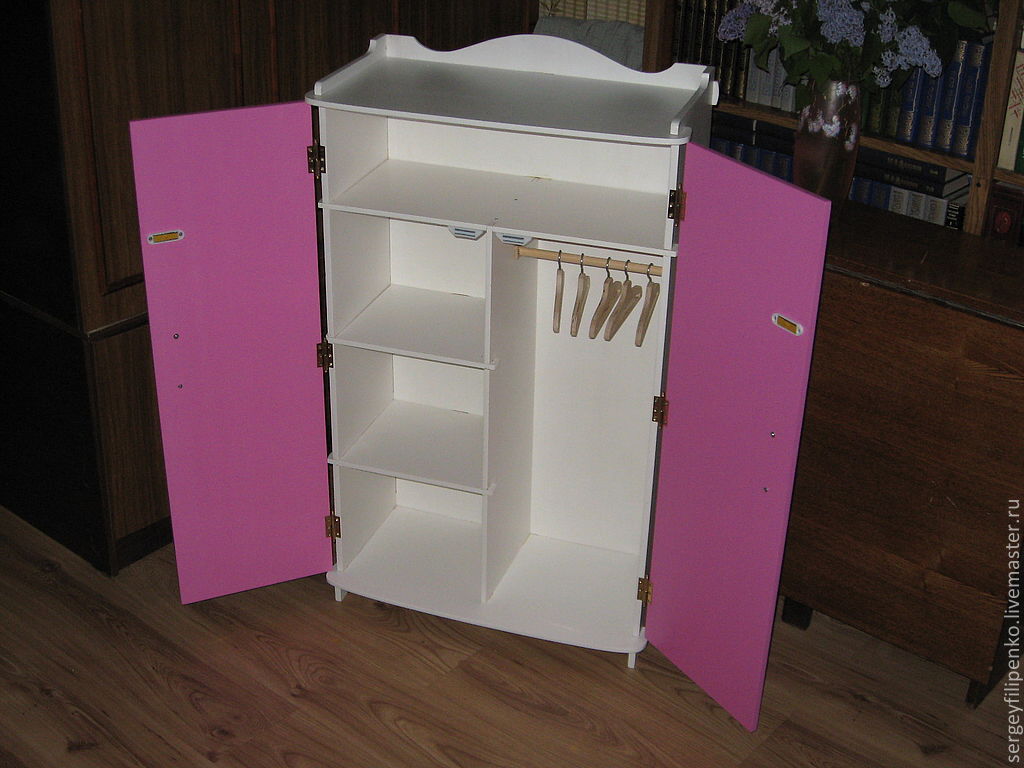 Если жительнице маленького дома негде держать наряды, то мебель легко изготавливается своими руками. Достаточно найти подходящую картонную коробку, которая поместится в «жилое» кукольное пространство.