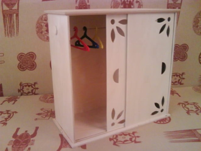 Внутренние поверхности и наполнение шкафа лучше выкрасить акварелью, а на внешние стенки можно нанести самоклеющуюся пленку или приклеить любой плотный материал, который найдется в доме. Дверки можно украсить по примеру шкафа-купе и нанести на них пищевую фольгу, а ручки легко заменить красивыми бусинами.