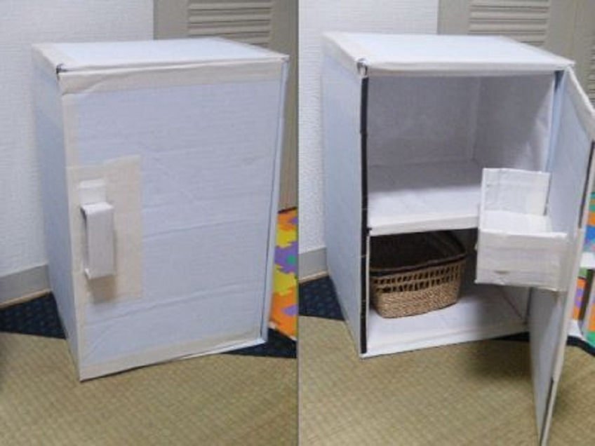 Ее мы также делаем из двух кусков картона высотой, как и сам шкаф. Дверь должна беспрепятственно открываться и закрываться. Берем маленькие петли и крепим их изнутри к основе, а потом к будущим дверям. Если не совсем понятен процесс, можно посмотреть его на видео.