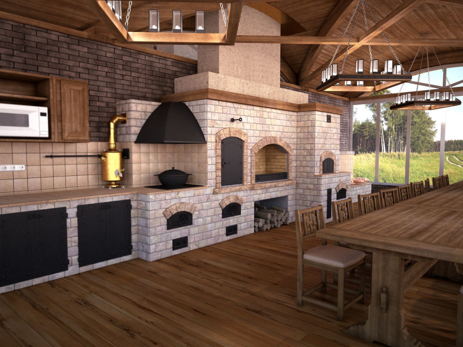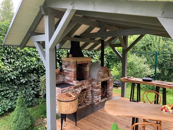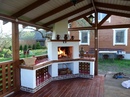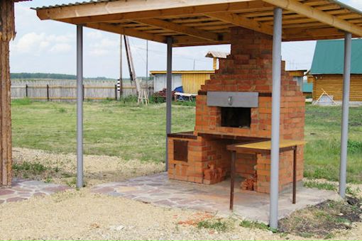 - Зона отдыха и барбекю. Кровля на кирпичных опорах.