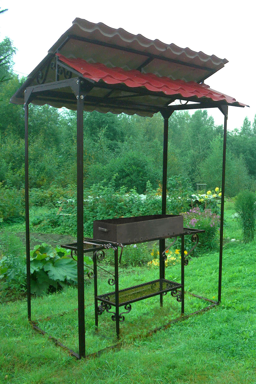 Для небольших конструкций из металла выполняют каркас и крышу над мангалом. Стойки усиливают с трех сторон поперечными перегородками, которые проходят в местах жаровни.