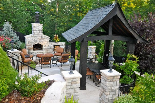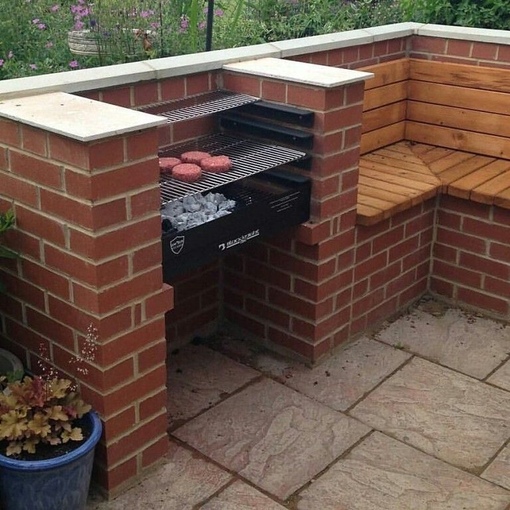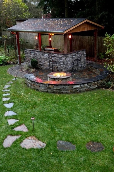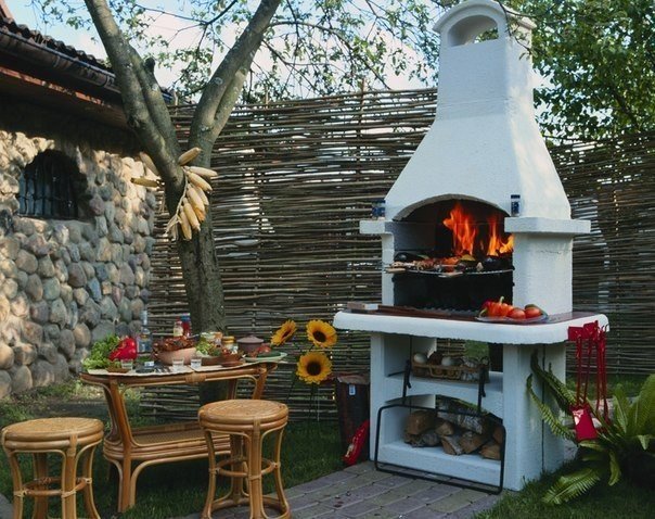 Они смотрятся дорого и красиво. В дальнейшем, в зоне печи или мангала можно возвести от одной до трех стен, предохраняющих открытый огонь от ветра.