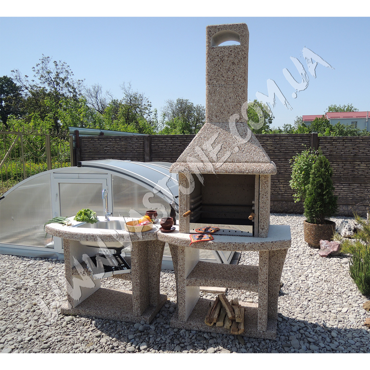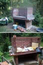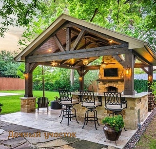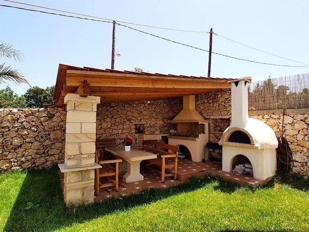 - Красивое место для отдыха, выполненное из камня и кирпича. Кровля находится над зоной кухни.