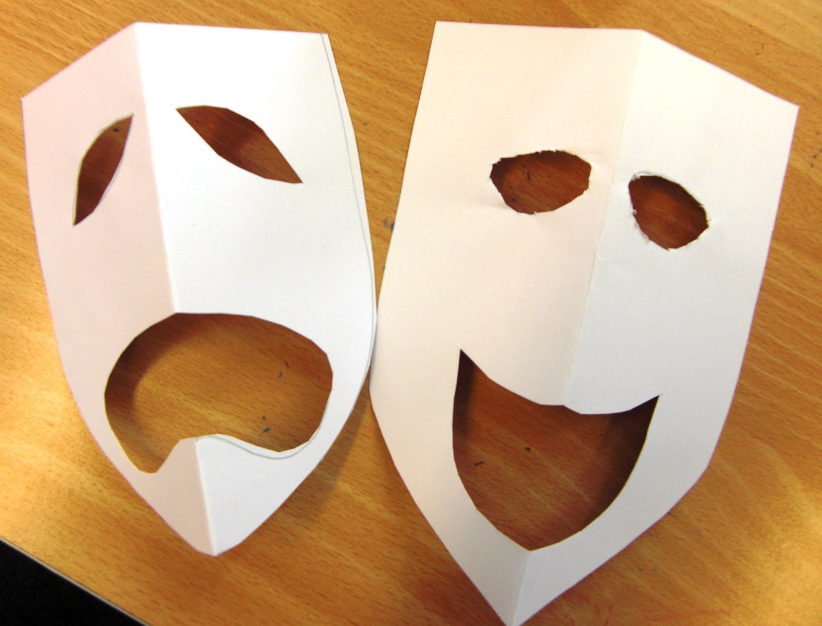 - Нарисовать по размеру лица маску, по форме напоминающую перевернутую грушу. На верней части маски сделать два надреза глубиной 2 см. Вырезать отверстия для глаз.