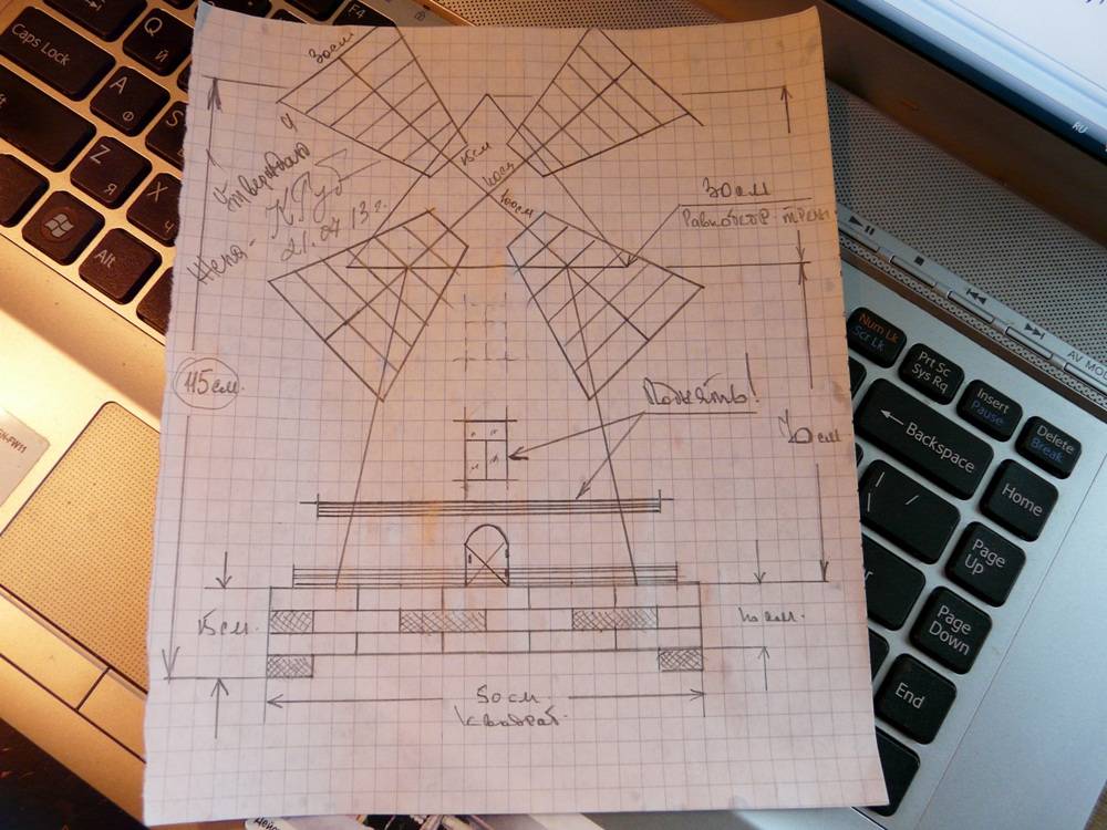 - Чтобы быть уверенным в успешном исходе дела, делайте чертежи декоративной мельницы и каждого элемента в отдельности. Это поможет упорядочить работу и сверить полученных результат с рисунком на бумаге.