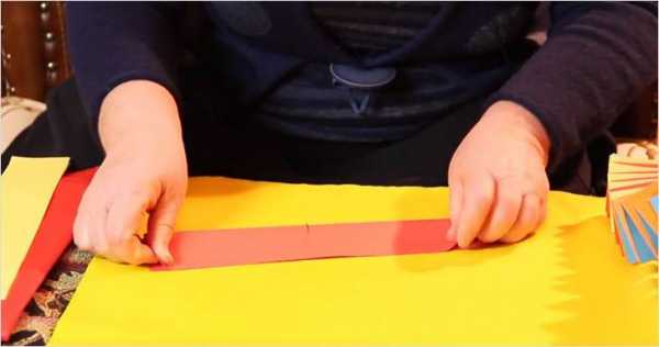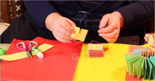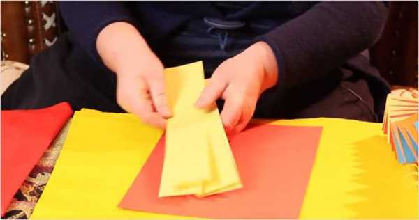 Возьмите цветную бумагу, сложите листы пополам, разметьте их с обеих сторон и разрежьте по намеченным отрезкам, не доходя до противоположного края (2−3 см). У вас должна получиться длинная бумажная гармошка.