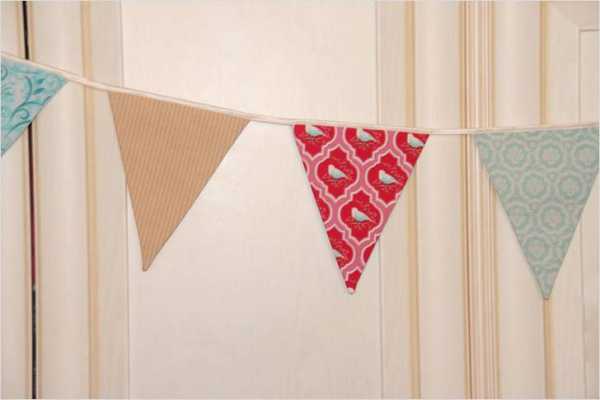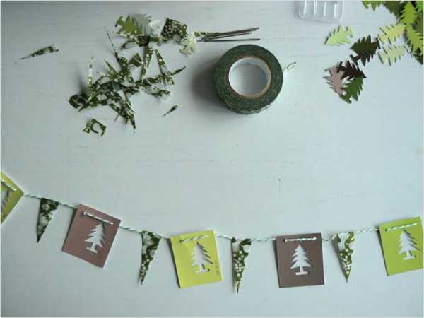 Сейчас в магазинчиках для рукоделия продается цветной скотч с очень симпатичными узорами. Из него тоже можно сделать гирлянду, просто закрепив его на веревке и обрезав в виде флажков.