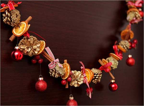 Затем с помощью иглы нанизываем их на нить и наше украшение готово! Кстати, оно не только преобразит ваше жилище, но и распространит по нему приятный цитрусовый аромат. Вместо кожицы можно использовать яблоки и обычные еловые шишки, иногда их выкрашивают в какой-нибудь неординарный цвет или же просто в натуральном виде насаживают на нить.