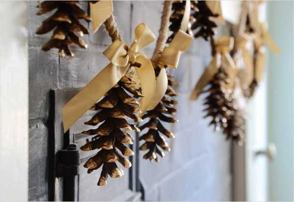 Для того, чтобы она смотрелась эффектнее и сочеталась с вашим интерьером, шишки также можно покрасить, используя акриловую краску. Налейте немного краски в одноразовую тарелку и обмакните шишку со всех сторон (или используйте кисть). После того, как краска подсохнет, шишки можно привязать на яркую шерстяную нить контрастного оттенка, например, красную.