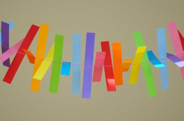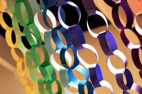 Разрезанные полоски склеиваются в одну общую гирлянду по принципу обычной цепи, которая состоит из звеньев. Чтобы получить что-то более оригинальное, попробуйте поиграть с формой звеньев: сделать их квадратными или даже объемными, правда, это уже будет немного сложнее. Можно сделать еще проще: цветная бумага нарезается на тонкие полоски, а затем их необходимо сшить по центру друг с другом, обычно для этих целей используют машинку, но справиться можно и вручную.