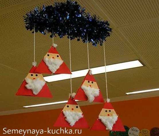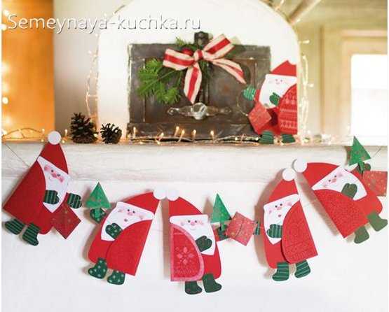 Вот идеи для гирлянд подвесок с изображением Деда Мороза, проще всего вырезать из красного картона треугольники, к ним из бежевой бумаги приклеить полоску лица и бороду из ваты.
