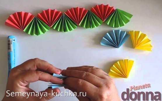 Можно веер надрезать так, чтобы у него получилась ножка по центру как на фото гирлянды ниже.
