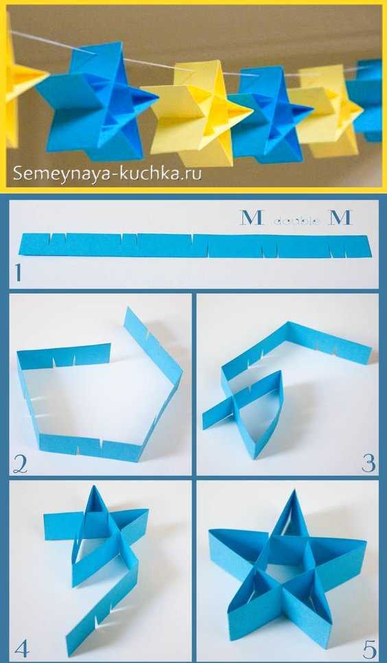 А вот идеи, где гирлянды сделаны в форме символа Нового Года – звезды. На нашем сайте есть статья, где мы делаем звезды из бумаги – там вы найдете много разных способов. А здесь я выкладываю те, которых нет там .