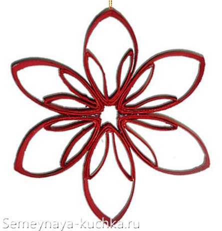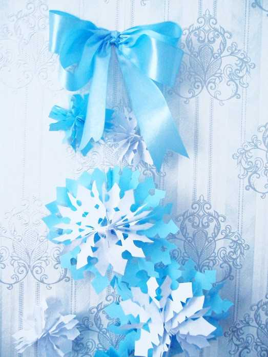 Дальше каждую снежинку соединяем с помощью обычной нитки или серебристого дождика, а затем подвешиваем ее к потолку. Кстати, красивее такие украшения будут смотреться, если их будет много, поэтому лучше сделать 5-10 таких гирлянд, в зависимости от цели и места использования.
