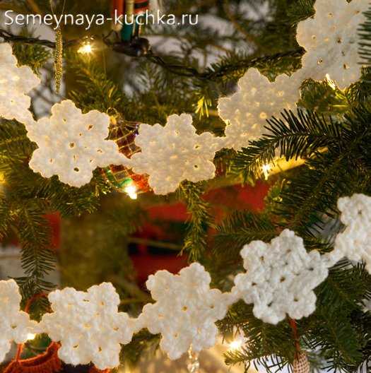 Можно связать маленькие снежинки и нанизать из на гирлянду. Много схем снежинок связанных крючком, выложила в специальной статье «Вязаные снежинки крючком»