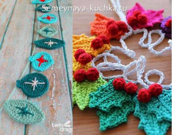 Ваши вязаные модули на гирлянду могут изображать любой символ Нового Года – елочные игрушки, листочки остролиста.