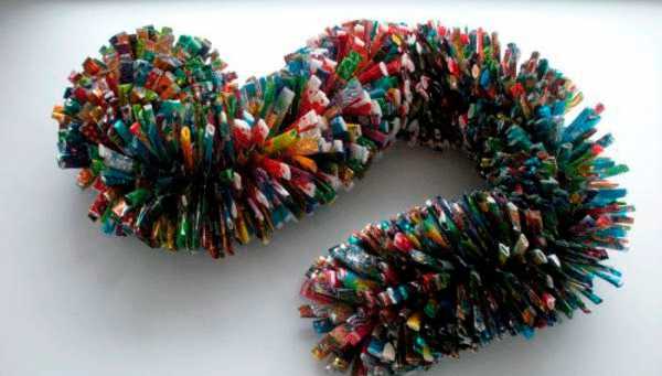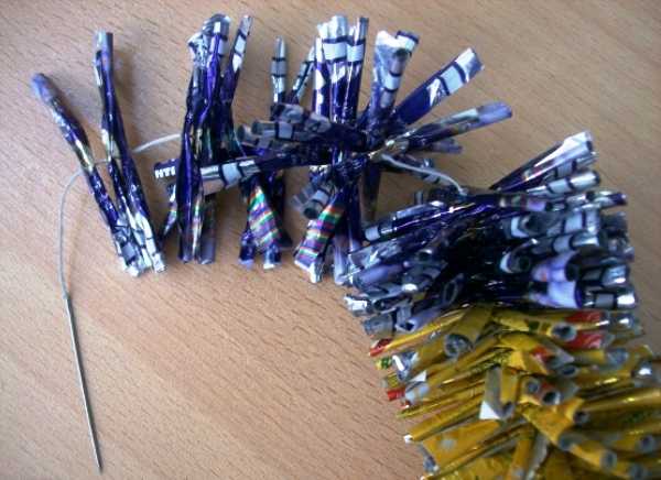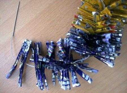 3. Приготовьте плотную нитку с иголкой и начните поочерёдно нанизывать трубочки. Края трубочек развернуться — это хорошо, т.к. мишура получится пушистой.