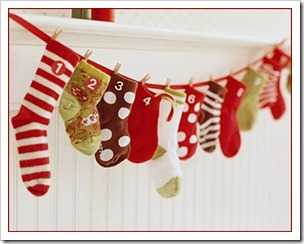 Как вам такая идея: посреди комнаты протянута бельевая веревка, на которой старый Санта и его верные олени развесили сушиться свои праздничные наряды: красные колпаки, варежки, сапожки с бубенчиками, большие штаны, мешок… Для начала придется сшить миниатюрные одежки (можно, конечно раздобыть подобные в магазинах игрушек, но это выйдет дороже), а затем закрепить их маленькими прищепками (можно использовать и большие, конечно же). Если не хотите долго морочиться, развесьте на «просушку» ваши варежки или красочные носки. А можно и то, и другое вперемешку. Можете вырезать просто из фетра или бумаги разноцветные сапожки и нанизать их на нитку.