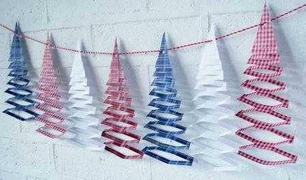 Такую гирлянду можно делать из вееров разной высоты. И тогда высокие веера будут похожи на ЕЛКИ. Из можно сделать зеленого цвета (как у елки), а промежуточные средние веера сделать белого цвета (как снег).