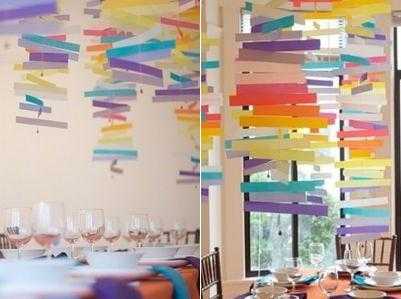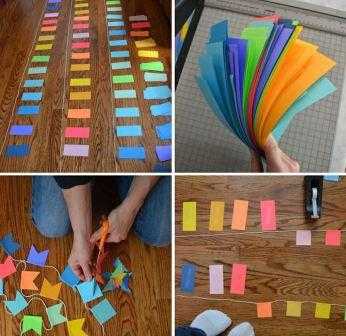 Можно из коротких полосок бумаги сложить маленькие веера (скрепить их степлером с одного края) или согнуть пополам и склеить половинки друг с дружкой (как показано на фото). И потом из вееров на тот же степлер (или клей) мы собираем цветную гирлянду. Ее можно повесить над дверью, пустить по стене, вдоль каминной полки, по карнизу шторы, вдоль лестничных перил.