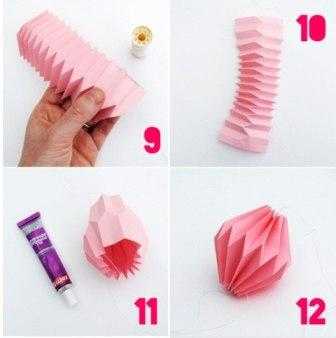 По такой же схеме делаются вот такие фонарики для гирлянды. Полоска бумаги складывается в несколько сгибов (в форме ромба). Вверху края соединяются степлером. Вокруг этого верхнего конца делаем обкуртку из серой полоски бумаги (цоколь лампочки получается).