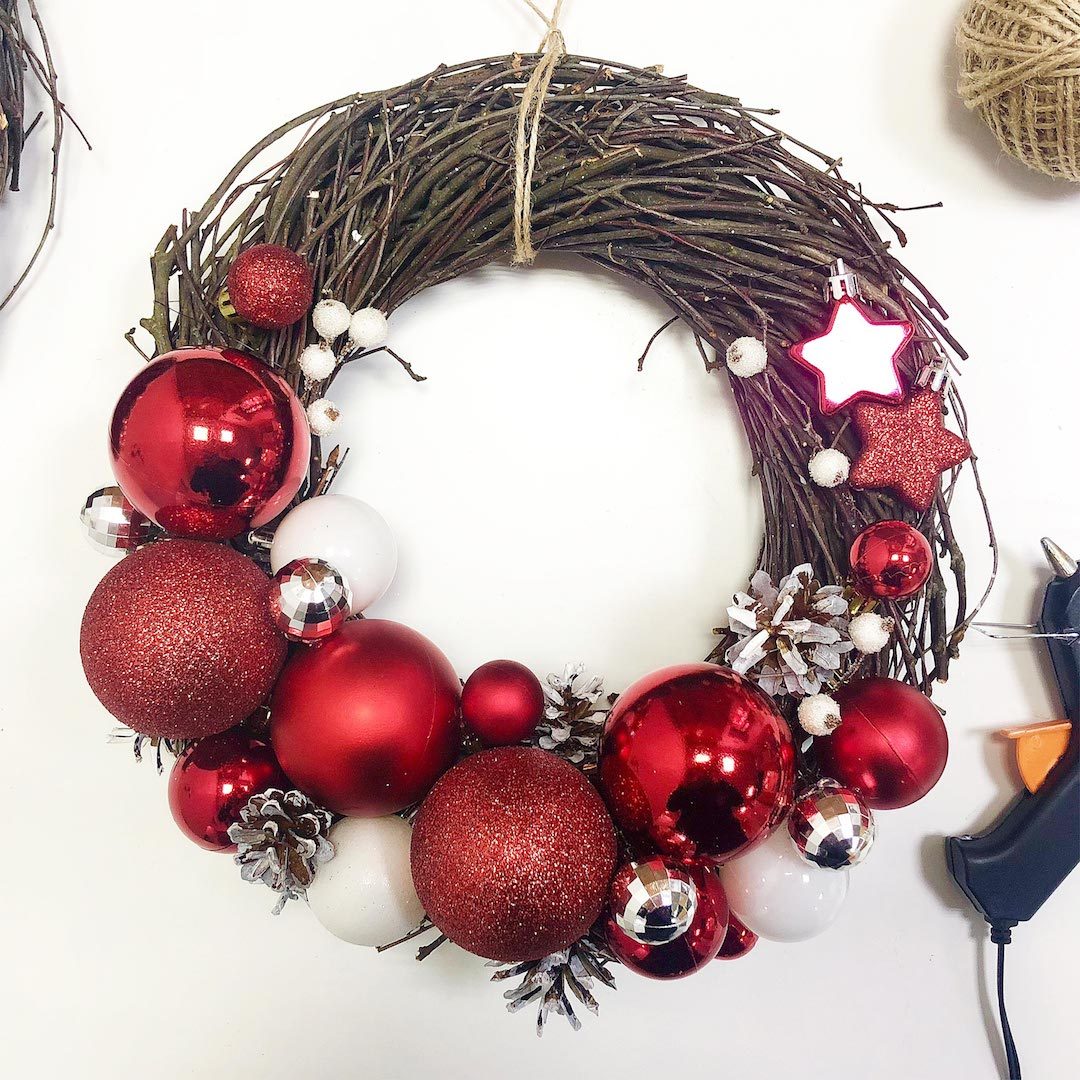 Для его изготовления понадобиться такая же основа, как и для хвойного – сделанный из толстой проволоки большой круг. На него нужно последовательно нанизать за “ушки” новогодние елочные шары. Очень красиво смотрятся венки с шарами разных размеров. Лучше выбирать шары двух-трех цветов – такие венки смотрятся очень празднично и стильно.