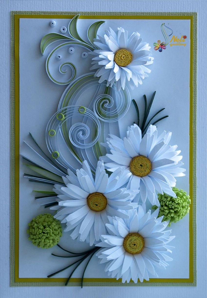 Чтобы освежить композицию, можно добавить маленькие ромашки. Делаются они так же, как заготовки для роз, только из полосок белой бумаги толщиной 5 мм. Сложенные гармошки склеить в кружок. Если малыш где-то загнёт неверно, не страшно. Конечно, надо учить правильно складывать, но эта работа тем и интересна, что неровности при вырезании или складывании не сильно заметны.